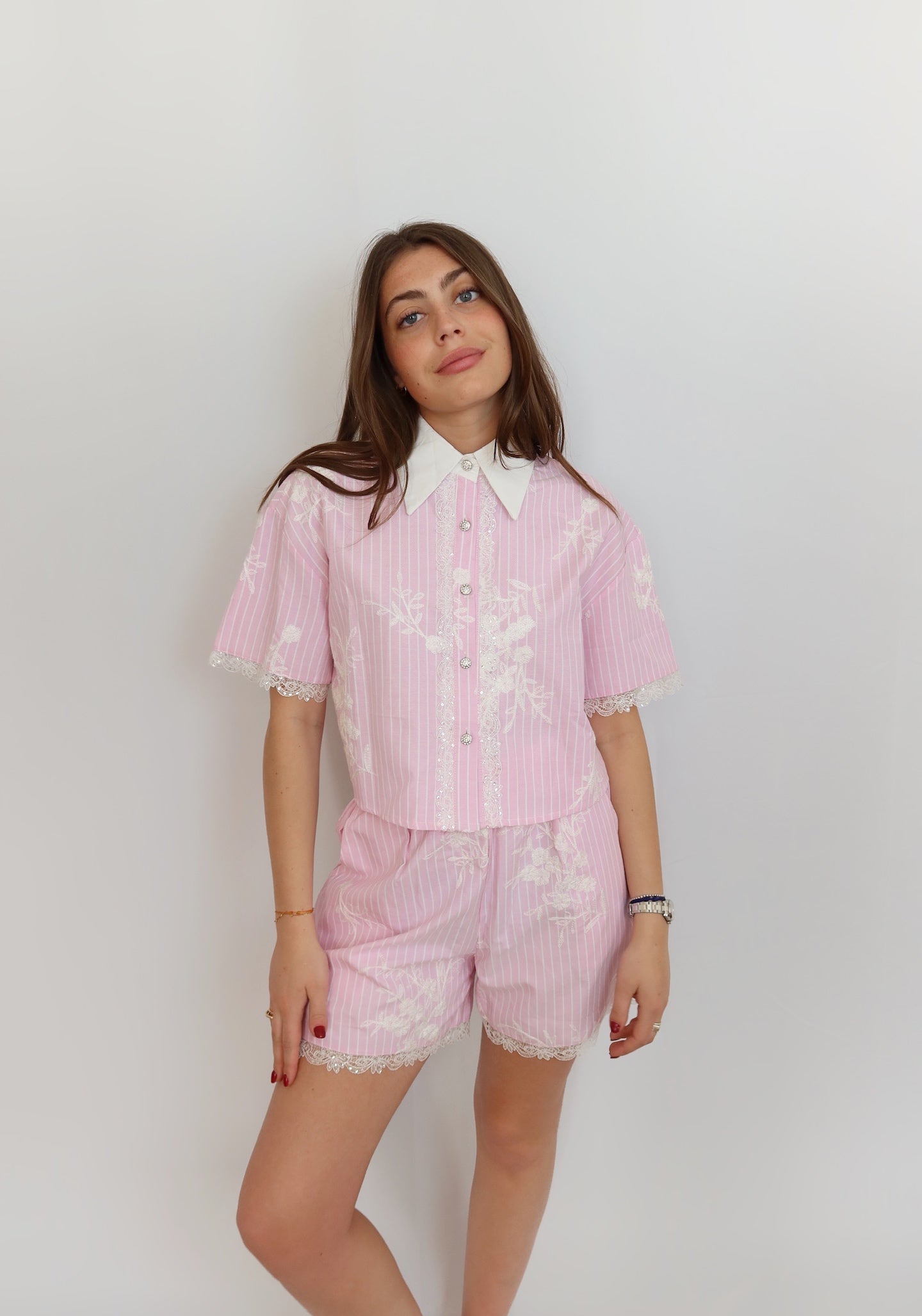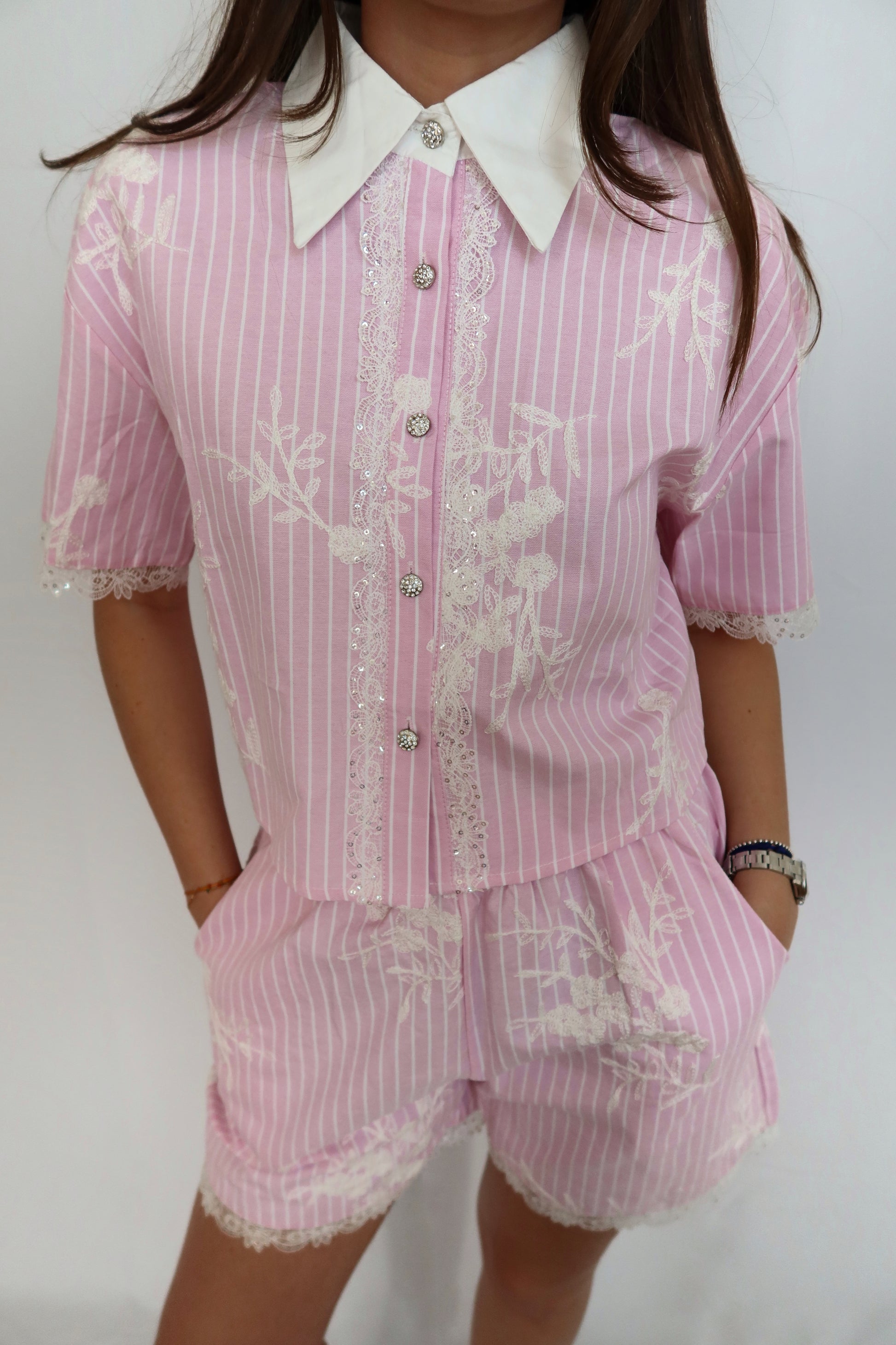 Chemise manches courtes à col blanc contrastant, ornée de dentelle brodée et de boutons bijoux.